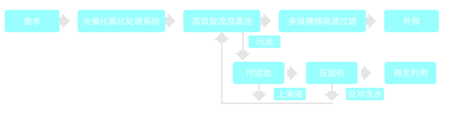 油田采油回注水進(jìn)入光催化氧化處理系統(tǒng),利用光催化改性陶瓷介質(zhì)作為載體,以可見(jiàn)光為光源,提高活性極強(qiáng)的羥基自由基的產(chǎn)率,通過(guò)羥基自由基與廢水中有機(jī)物的加成、取代、電子轉(zhuǎn)移等反應(yīng)使大部分有機(jī)污染物礦化為二氧化碳、水等簡(jiǎn)單無(wú)機(jī)物。出水再進(jìn)入高效旋流澄清池,投加改性淀粉絮凝劑,使池中形成活性油渣層,強(qiáng)化廢水中細(xì)小油粒與活性油渣層內(nèi)較大油滴的接觸絮凝過(guò)程,從而高效除油。同時(shí)在裝置進(jìn)水區(qū)設(shè)計(jì)出獨(dú)特的喉管混合結(jié)構(gòu),使池中形成小而密實(shí)的絮凝體,提高旋流澄清池的絮凝效率。出水經(jīng)輻射式多級(jí)精細(xì)高速過(guò)濾器處理后可達(dá)標(biāo)外排。