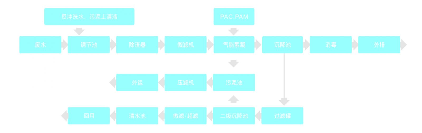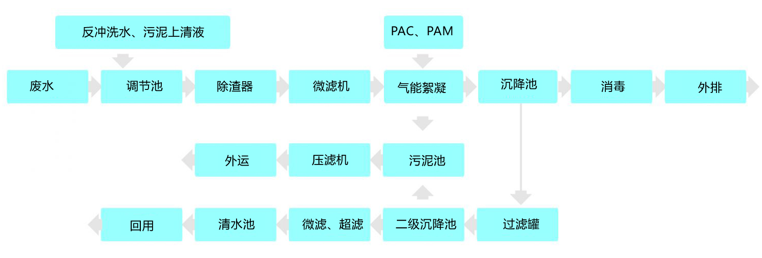 廢水首先進入調(diào)節(jié)池進行水質(zhì)、水量調(diào)節(jié),提升后進入兩級高濃除渣器去除廢水中的顆粒雜質(zhì),然后經(jīng)微濾機收集廢水中相對細小的棉渣回用,為后續(xù)處理工藝減輕負荷。出水經(jīng)泵提升至氣能絮凝系統(tǒng)加藥(PAM與PAC)混合后去除原水中所含的大量膠質(zhì),出水到沉降池,上清液經(jīng)消毒后可達標外排。如中水回用,則提升至多級精細過濾系統(tǒng)過濾后進入中間水池,經(jīng)超濾系統(tǒng)處理后回用。