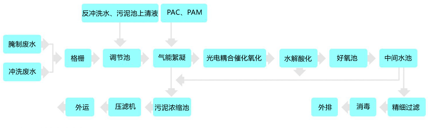 蔬菜腌制及車間沖洗廢水首先進(jìn)入格柵截留廢水中大的雜物后與各系統(tǒng)反沖洗水、污泥濃縮池的上清液匯合后進(jìn)入調(diào)節(jié)池,進(jìn)行水量和水質(zhì)調(diào)節(jié),并通過厭氧作用去除部分COD后進(jìn)入氣能絮凝系統(tǒng),通過投加絮凝劑進(jìn)一步去除污水中絕大部分懸浮態(tài)的無機及有機雜質(zhì),出水進(jìn)入光電耦合催化氧化反應(yīng)器,通過電解降低廢水中所含的高鹽成分,提高活性極強的羥基自由基的產(chǎn)率,通過加成、取代、電子轉(zhuǎn)移等反應(yīng),將廢水中大部分有機污染物轉(zhuǎn)化為簡單無機物。出水經(jīng)過水解酸化后進(jìn)入好氧池,進(jìn)一步去除COD、氨氮等各類污染物,再經(jīng)多級精細(xì)過濾、消毒后達(dá)標(biāo)排放。
